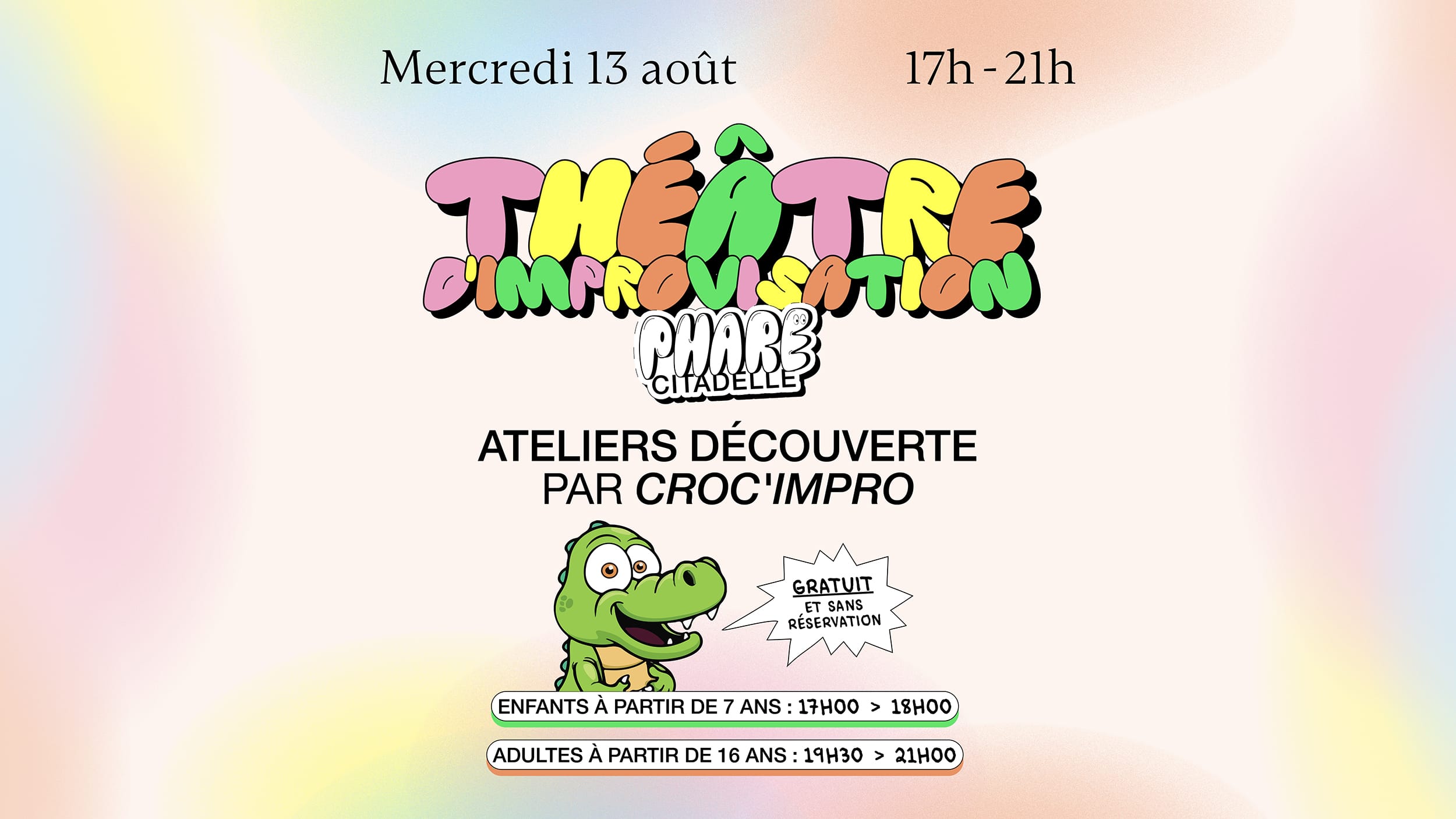 13.08 @ 17:00 - 21:00 Ateliers découverte théâtre d’improvisation par Croc’Impro ! Phare Citadelle 13 Rue De Nantes, 67100 Strasbourg, France, Strasbourg